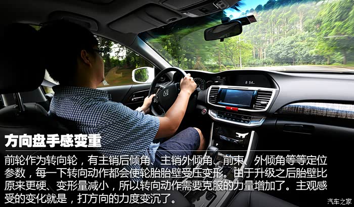 特别是高速巡航的时候,原本的雅阁舒适安逸,但升级轮胎之后底盘就像是刚刚拧干水之后的毛巾一样变得略微绷紧,给我们回馈的更多是扎实和安稳,以往因为轮胎形变而带来的细小轻浮感被榨得一干二净。不过因为悬挂还是原厂状态,所以对于路面起伏的吸收依然积极,车身没有像运动型悬挂那样跳动明显,所以尽管轮胎变薄了,但其实整体的舒适性并未受到大影响,很符合我的用车需求。
