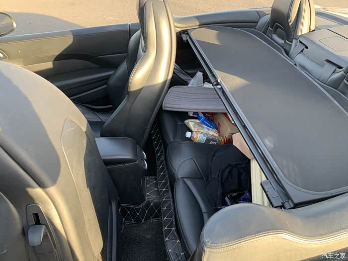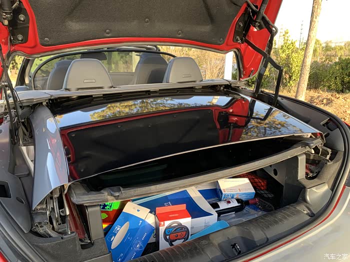 折叠后的顶棚在这里。敞篷后的后备箱容量直线下降,开口很小,只能放一些零碎的小东西。后备箱我没收拾,太乱了