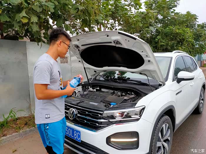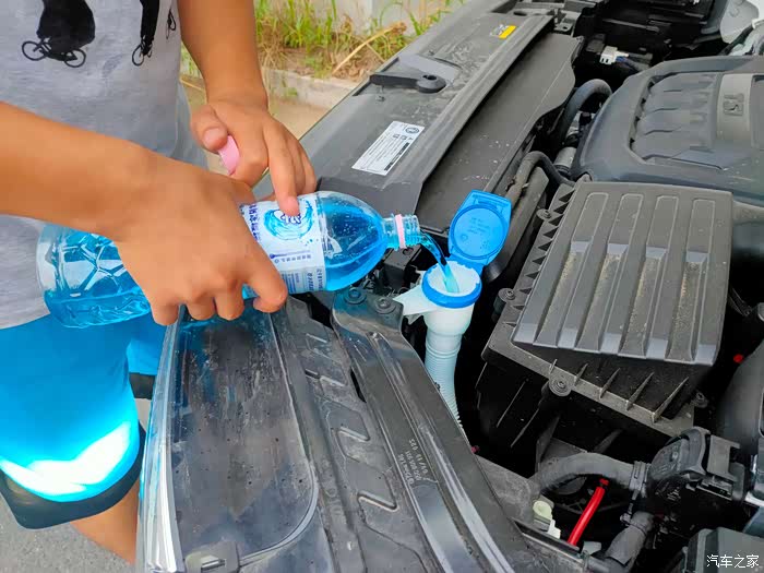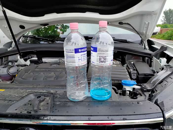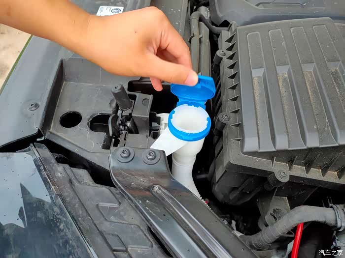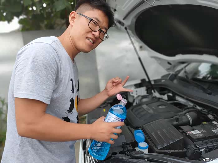 给探岳加注清洗液,加满将近两瓶,我估计也就两瓶“雪花淡爽”的量吧!
