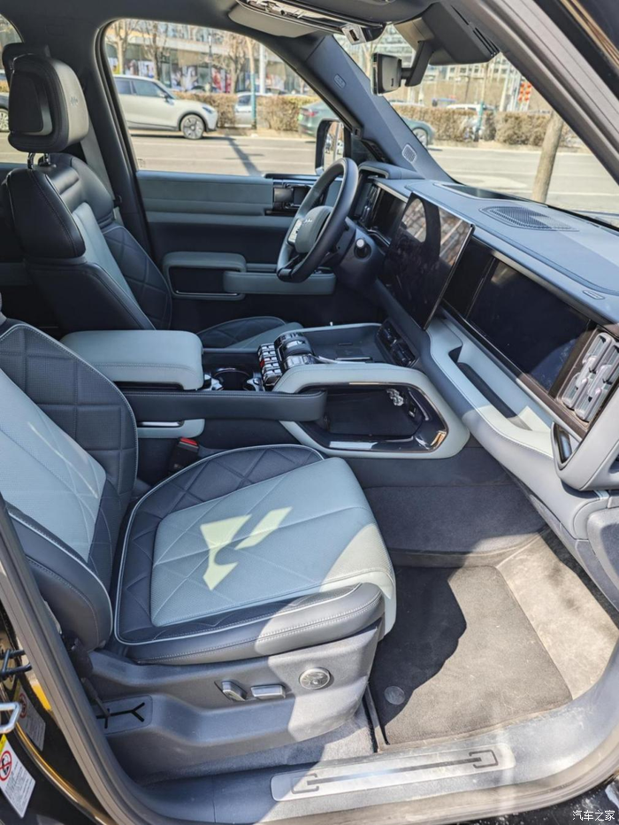 内饰选的是浅滩绿,这颜色不沉闷,本来车就是黑色了,这样刚好搭一下;前面一共有三块显示屏,中控屏幕还可以分屏操作,副驾驶想要听个音乐,看个电影或者开个座椅通风加热都可以自己调,非常的方便;岛台是双层的设计,平时开车的时候手机可以放在上面充电,下面可以放一些小杂物。