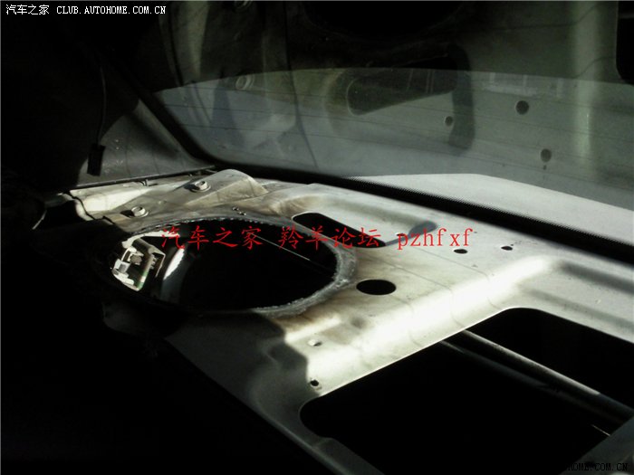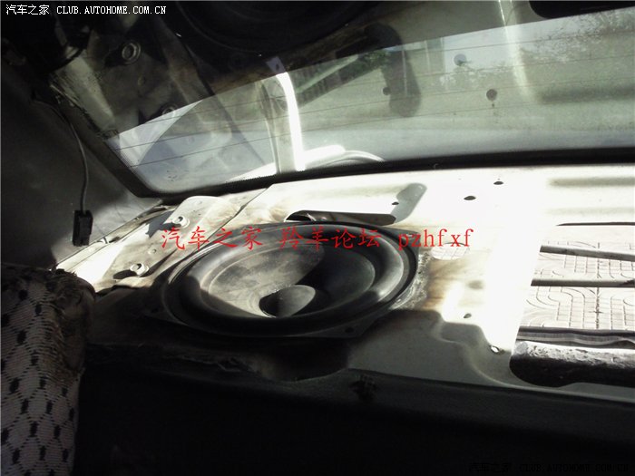 把6寸的低音单元放在后面。由于新喇叭的尺寸要大的多,因此必须给车上的原喇叭位置扩孔。看,这是我以前找朋友用气焊扩的孔,搞的黑漆漆的,不过没办法,用气焊比用锯子快的多。