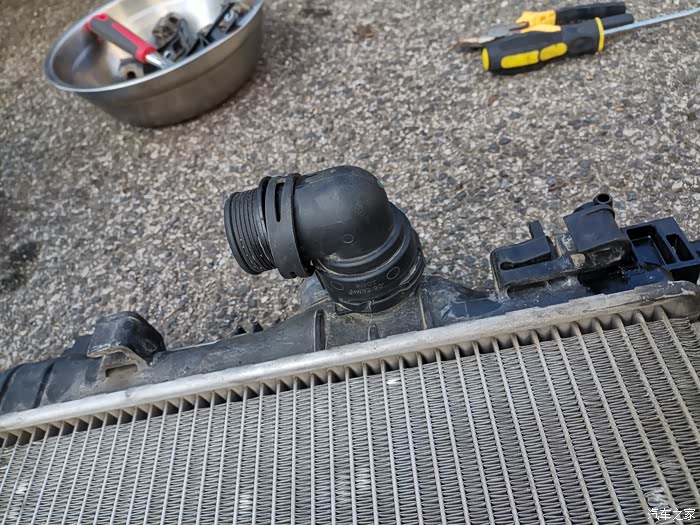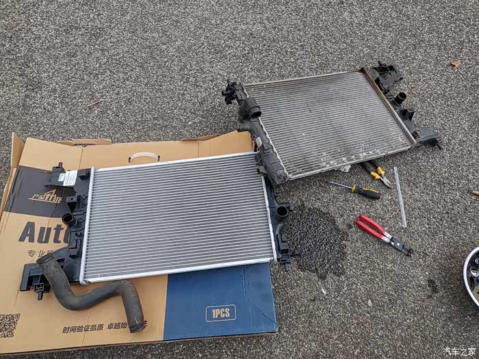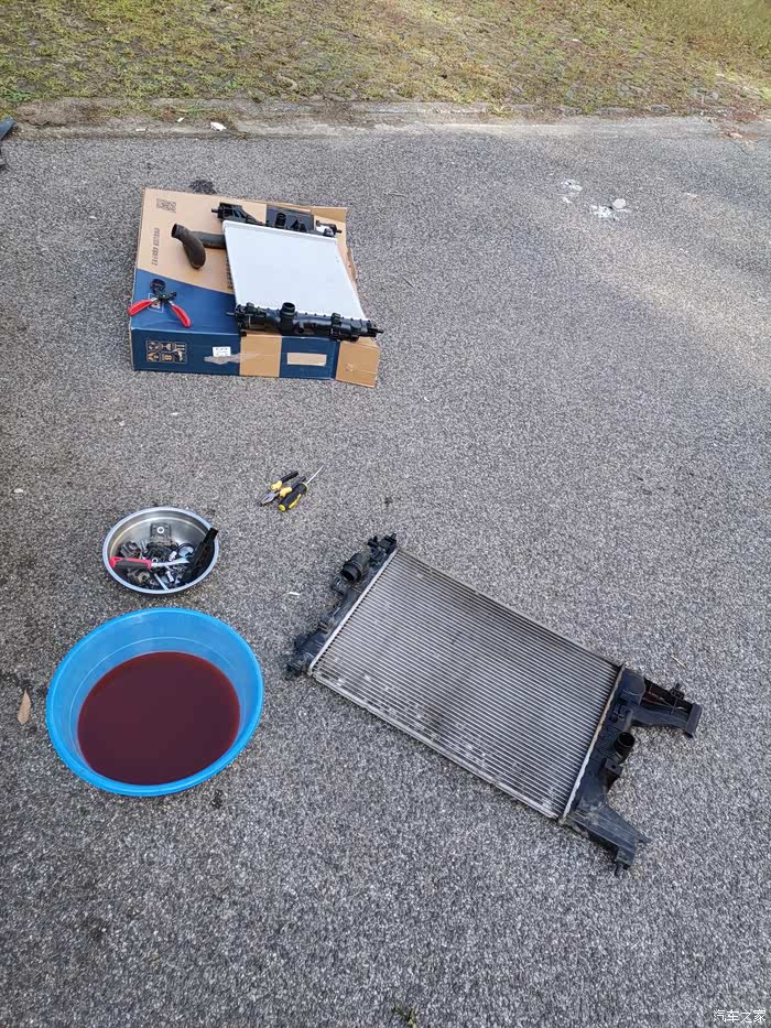 放出来的冷却液、拆下来的旧水箱、新水箱
