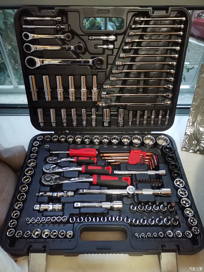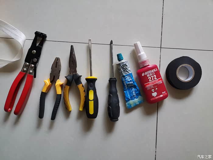 最左侧是拆水管卡扣的专用钳子!而且,彼此水管卡扣时这个钳子是必须要用的,否则,拆不下来!这个图片上的工具,本次只用到了卡扣专用钳和十字螺丝刀和发动机密封胶,其他的没用到。