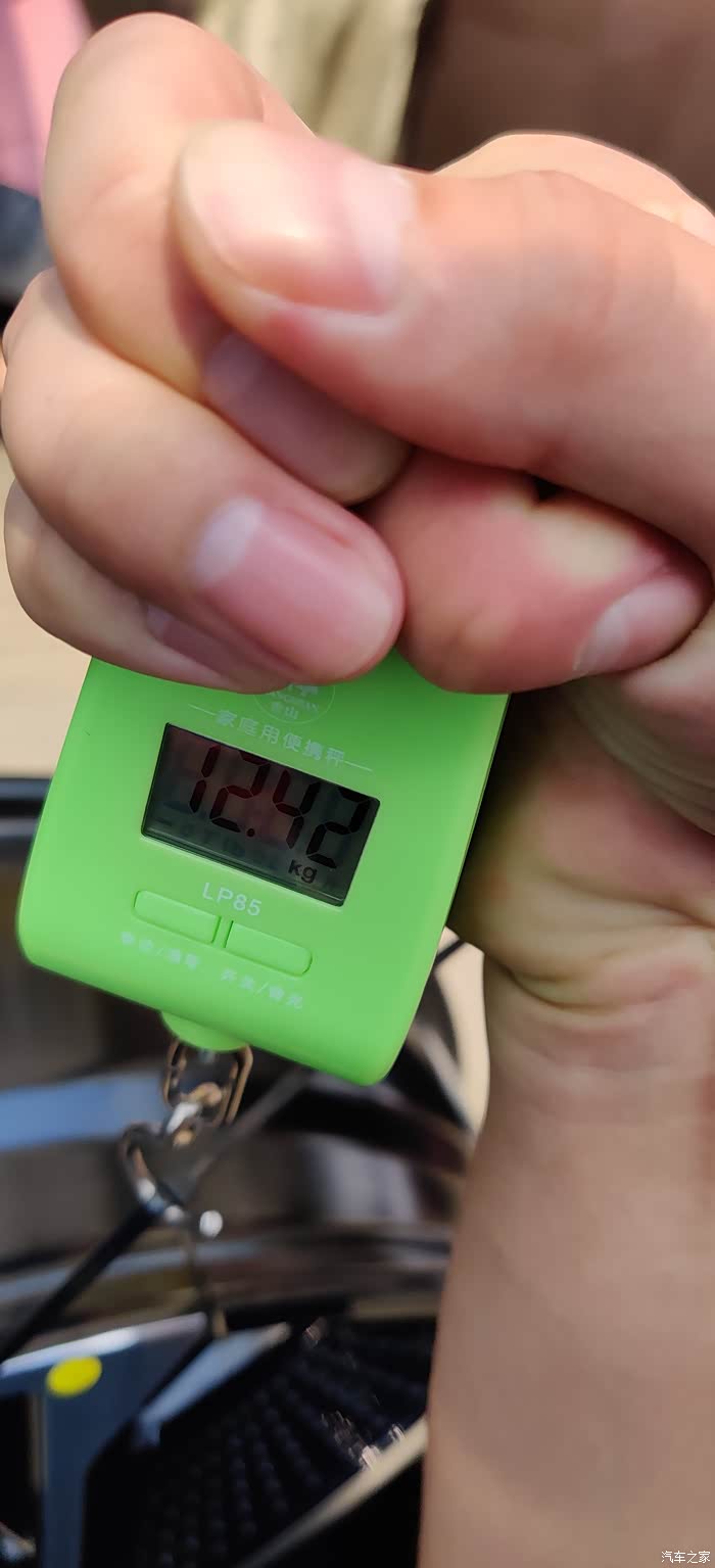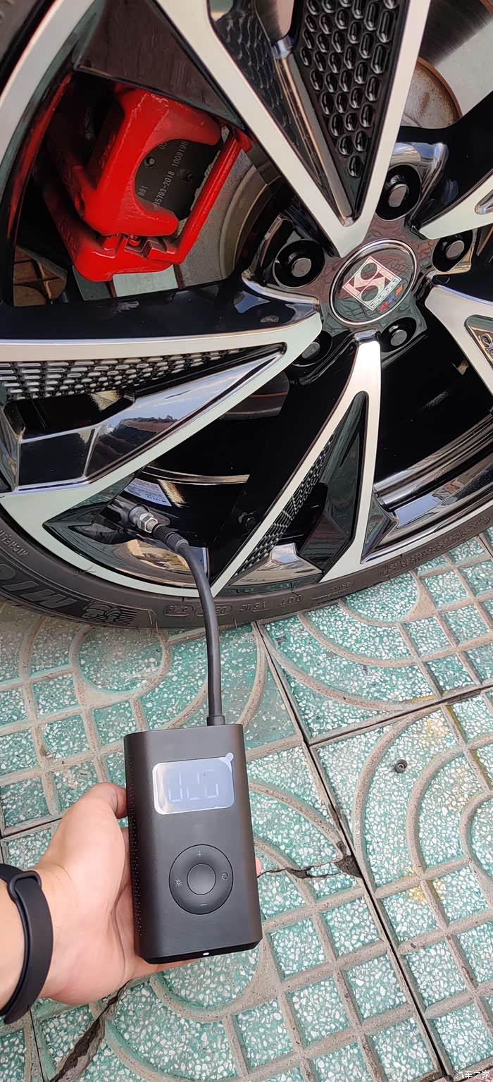 因为红旗的app能显示胎压小数点后两位,精度比较高,作为强迫症的我 肯定要左右轮子数据一致,所以拿出我的小米充气泵, 充到前轮2.4 后轮2.6,哈哈