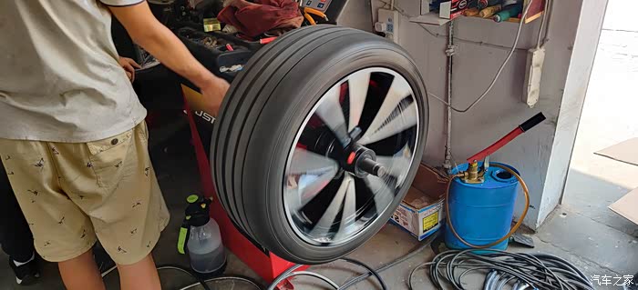 接下来就是把轮胎从旧轮毂扒下来, 装到新轮毂上了, 现在是已经把轮胎装到新轮毂上去了,在做动平衡中
