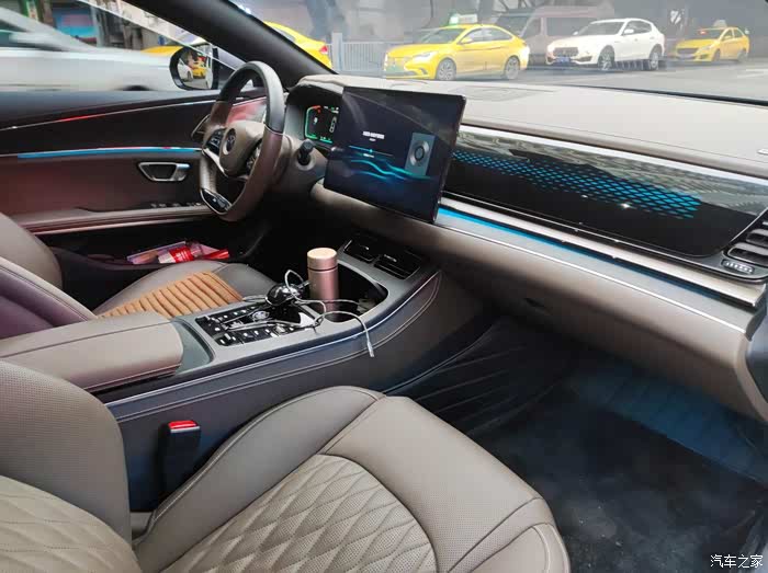 皮革和缝线搭配着木纹和金属的质感,再加上各种颜色的氛围灯,整个内饰的做工、用料和设计都没的说。