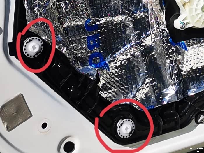 如果要给外门板加止震板,则用虎口钳将下图圈出的白色快扣逆时针扭开,再往外拔一点,因为这块塑料隔板连带着玻璃窗导轨,全部松开后只能打开一定角度,如下图二中红线,然后伸手进去贴止震板(止震板:防止门板在重低音是共振产生震动杂音)