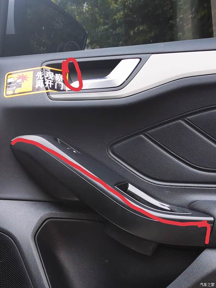 门板挡板拆卸见下图,开门把手处小挡板用薄片东西沿圈内缝隙插进去再往外带就撬开了,大把手用塑料撬棒(买止震板有赠送)沿红线撬开后往垂直门板方向掰。