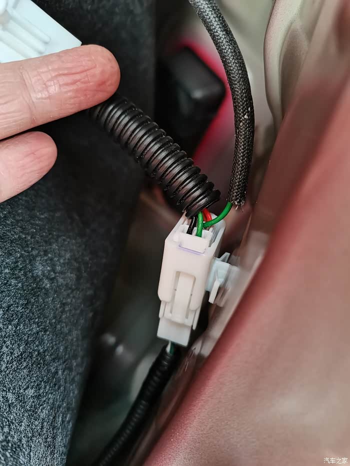 图中已经是用相同的插头对插进行无损取电完工后的样子了!这前面有图,拍了,但是手机上并没有,郁闷的我!好多细节图!绿色是倒车灯正电取电线,我用了玻璃纤维编织管护套,从左上角那个容易坏的口走到右下角这里!