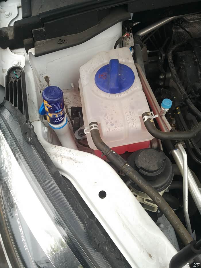 我们艾5群里有2个车友玻璃水加到冷却液里面去了,在这里特别指出,红圈里那个才是玻璃水加注口(老司机请嘴下留人,真有车友不知道)。请暂时忽略发动机舱的脏脏脏,待会有惊喜