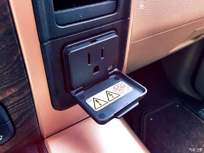 下方是一个150W的三项电源插座,这个功能非常实用。在长途自驾出行的时候可以直接给手机或者笔记本电脑充电。
