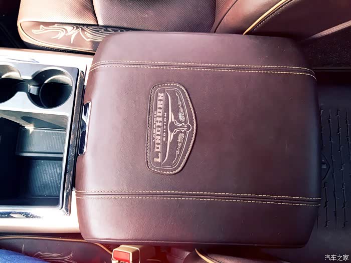 中央扶手箱可以用巨大来形容,有多大呢?坐上去一个10岁以下的儿童完全没问题。并且采用真皮材质包裹,以及长角号的刺绣徽章。