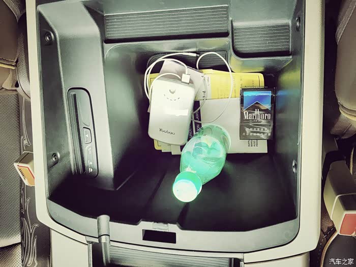 后方接着又是一个超大并且具有功能性的储物盒以及杯架,并且同样在底部采用防滑动材质。由于将旋钮式电子档杆设置在了中控面板上,所以贯穿式硕大的储物空间可以容纳日常所需的各种物品,而且便于分类。
