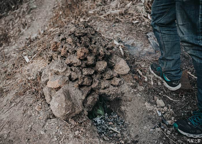 整个土窑的搭建是做土窑鸡最具有技术含量的工作,前后用了大概一个小时的时间。雏形搭建完毕再用小的土块把大的缝隙塞满。