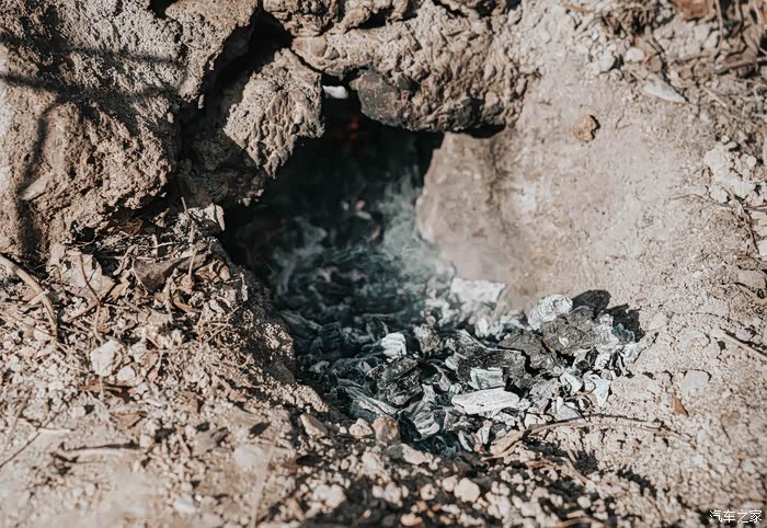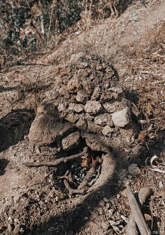 木柴已经烧成了炭火,整个过程用时大概1个小时。把下面的炭火铺开,还有足够的热量提供给土窑。