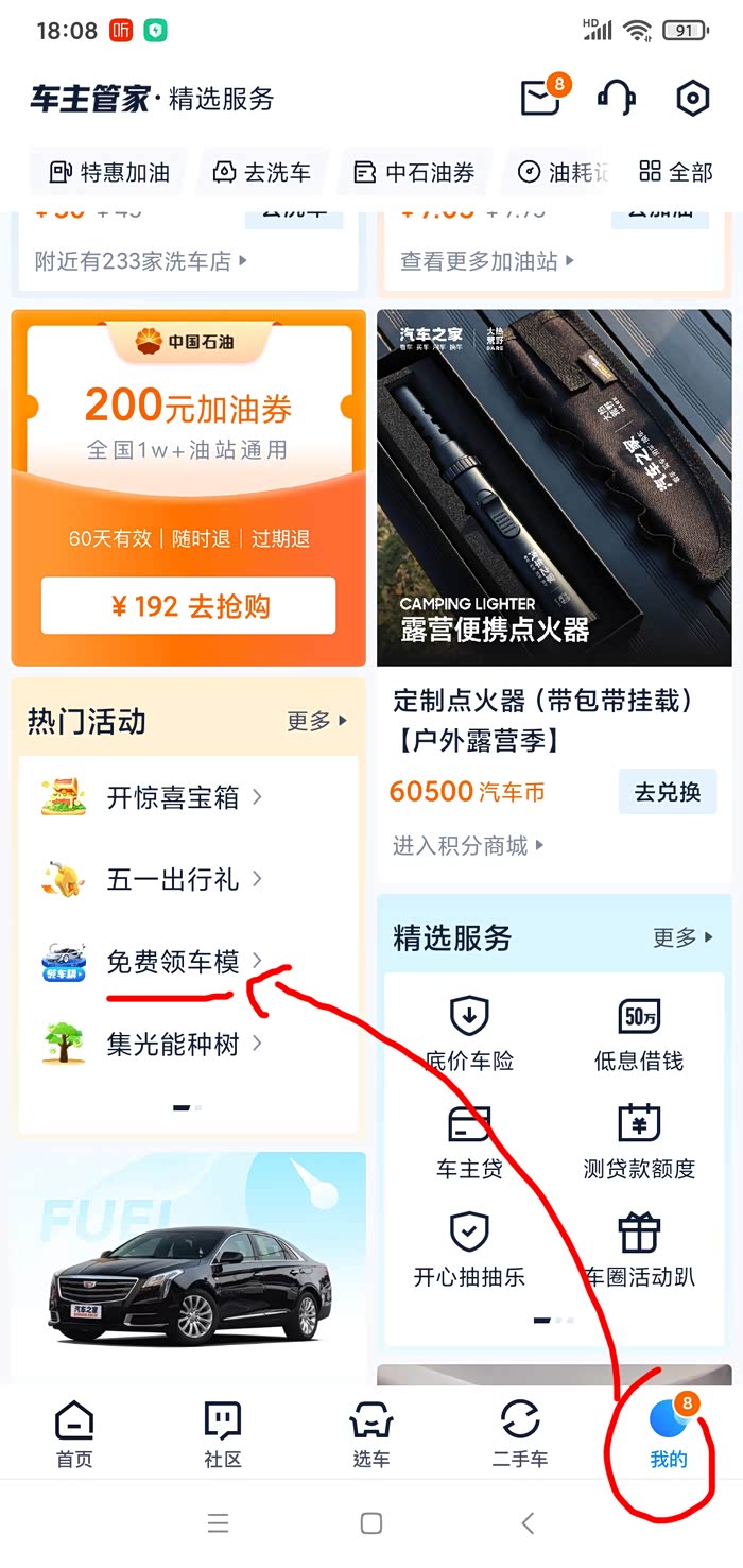 新用户可能不知道位置,我简单说下:最新版本下,点我的,页面望下拉。看到免费领车模点进去。