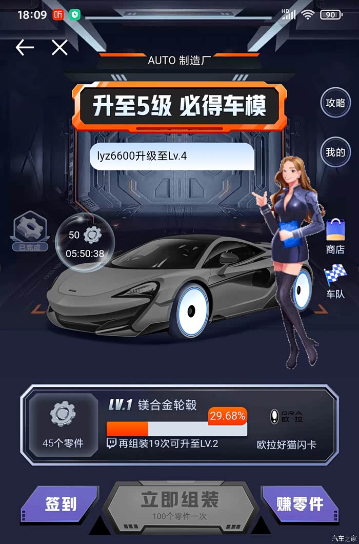 进来后就是这样的界面点:【立刻组装】。零件点签到、赚零件、车队等按键,能搞来零件。1-3级的时候,增长速度很快。到4-5级的时候,非常慢了,100零件才能增张0.01%,非常的慢。我用了一年多时间,每天点。