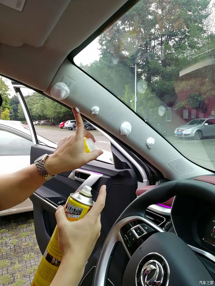 清洁第一步:往饰板上喷第一道泡沫清洗剂