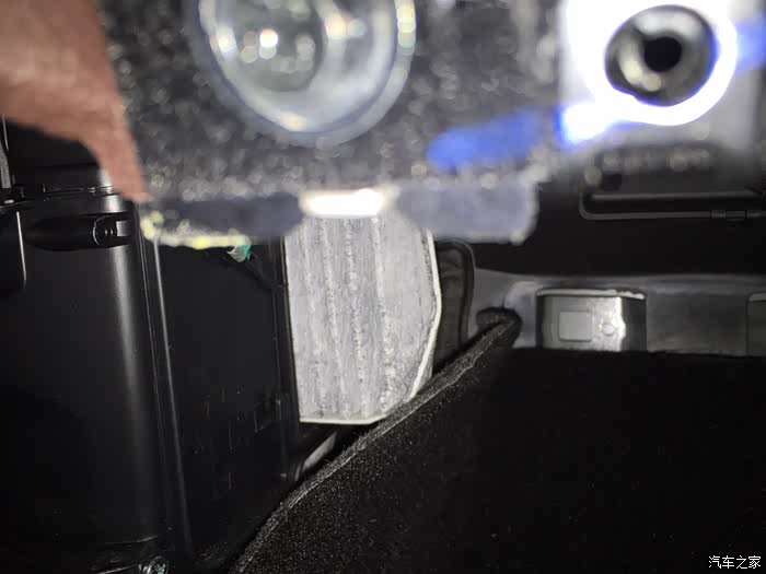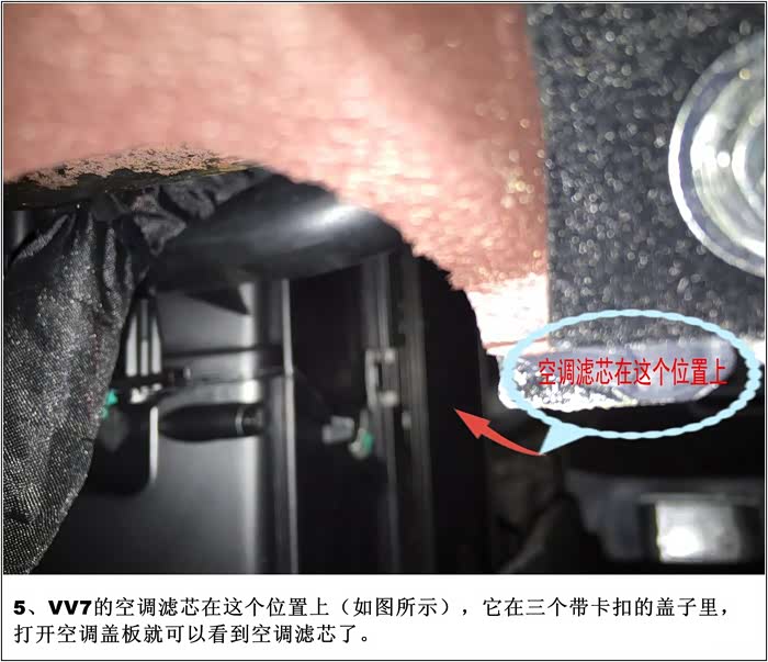 5、VV7的空调滤芯在这个位置上(如图所示),它在三个带卡扣的盖子里,打开空调盖板就可以看到空调滤芯了。
