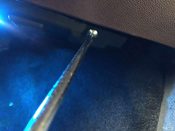 2、在手套箱下面(脚底灯面板上)一左一右有两颗螺丝钉,需要我们拆掉。(如图所示)