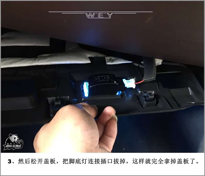 3、然后松开盖板(如图所示),把脚底灯连接插口拔掉,这样就完全拿掉盖板了。