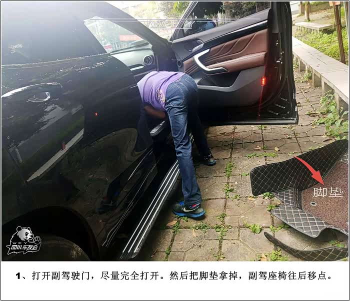 1、打开副驾驶门,尽量完全打开。然后把脚垫拿掉(特别是3D全包围的脚垫),副驾座椅往后移点。