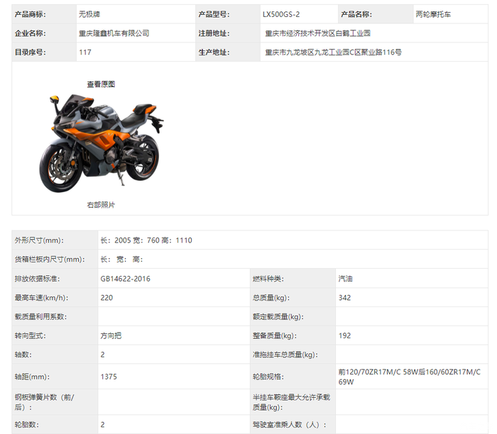 从工信部公布的信息来看,无极RR500S本次搭载了一台高性能的四缸发动机,型号LX460MR,实际排量475cc,最大功率57kw(最大马力77.5匹,设计时速220km/h),参数表现十分亮眼。(PS:但还是被钱江狙击了!同期工信部,钱江QJ新车QJ400GS-16S亮相,发动机型号QJ457MQ-D,实际排量421cc,最大功率也达到了57kw,属实逆天,若不是工信部公布的信息,真的不敢相信!)。怎么说呢!看到两款车参数一致,但总感觉钱江有点过分压制性能,不知道寿命会不会有影响。