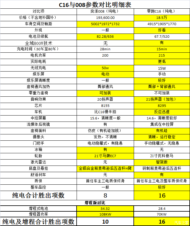 游吟歌手是008的真车主,做那个对比图也花了不少时间,为了表示敬意,我也对此表做了一点修正,比如008空间轴距大了10厘米,本是一项,在原表中被拆成七项了对比,增程器是一个部件,也被拆成四项来对比,C16的电子后视镜在中控屏,原表参数也误写为没有;800V纯电肯定是C16能耗更低的,008标的参数是实验场景,实际能耗会更高;这种对比法明显不符合实际,我把这些错误对比项剔除后,发现了不一样的结果,C16明显是胜出项更多的,并且零跑C16胜出的项大多是使用频率高的功能,008胜出的功能使用频率相对更低,综合考虑实际使用频率,C16就是大胜,而且价格低,品控好。