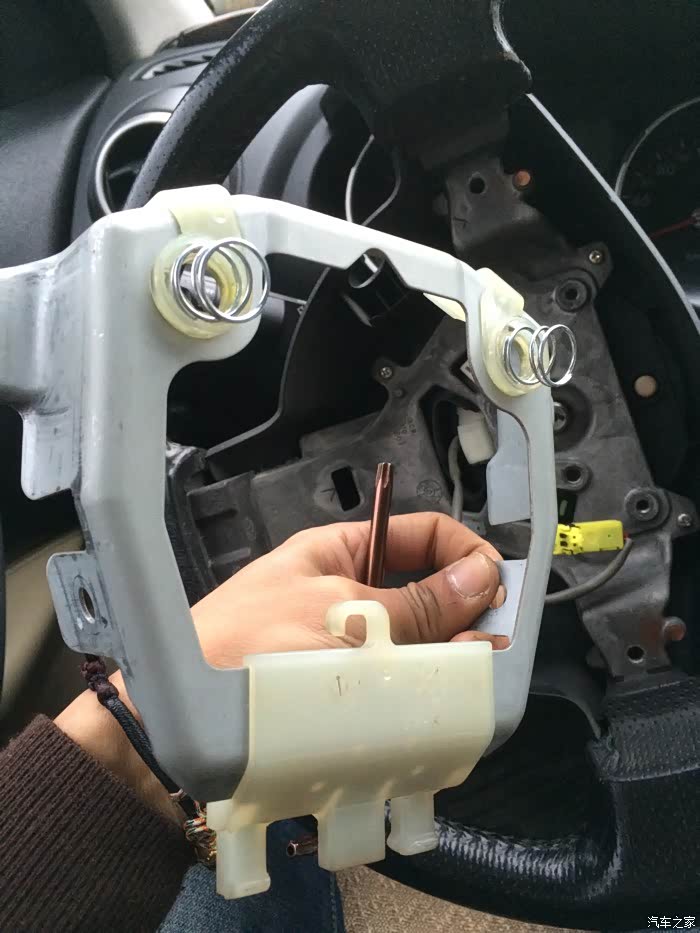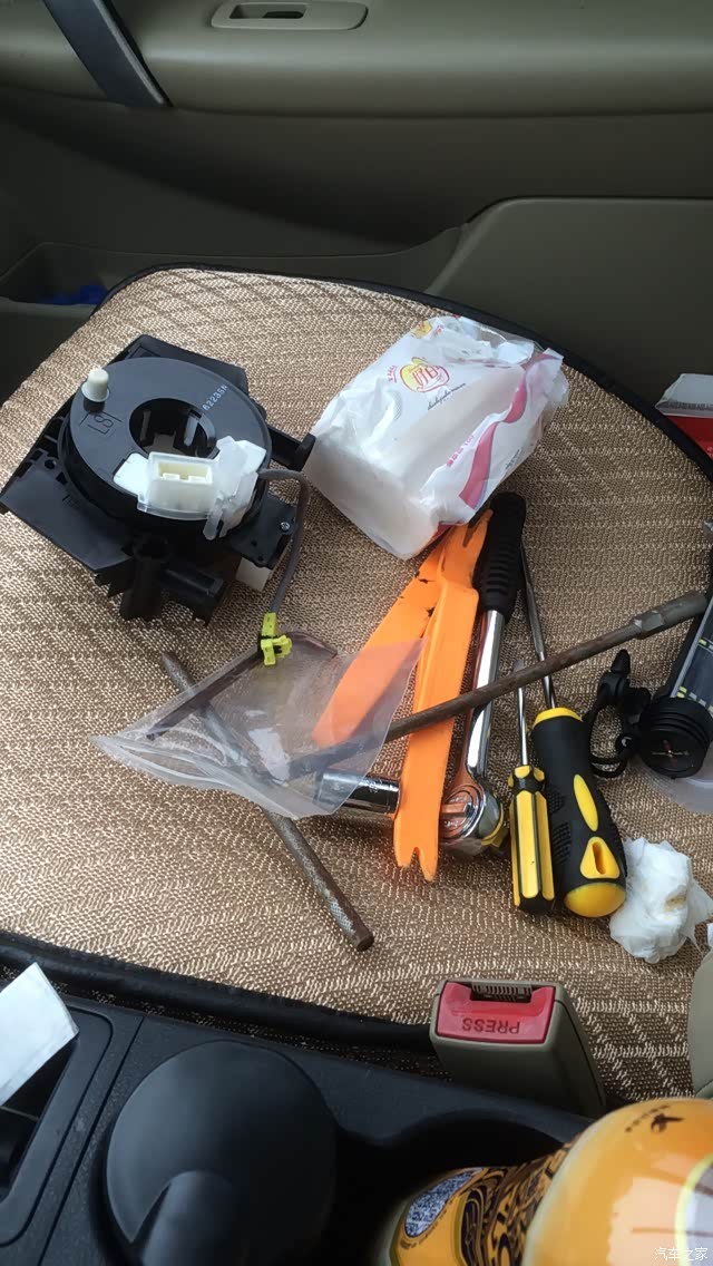 因为多功能按键时好时坏,近期有两个按键不管用,dvd上重新学习也不管用,初步判断游丝断了,更重要的是气囊灯闪烁,技师盒子检查出来是驾驶位开路,应该游丝嫌疑最大。恶补了枫桥兄的帖子,我觉得应该不难,但,但,下午三点搞到接近六点,期间套筒不够长,出去买,第一次拆炸弹,比较忐忑,抽了几根烟平复心情,我想说的其实是这个算补充贴吧(新逍客可以不用看,这个是老逍客的胎里毛病,现在改良款都多了两圈盘线)