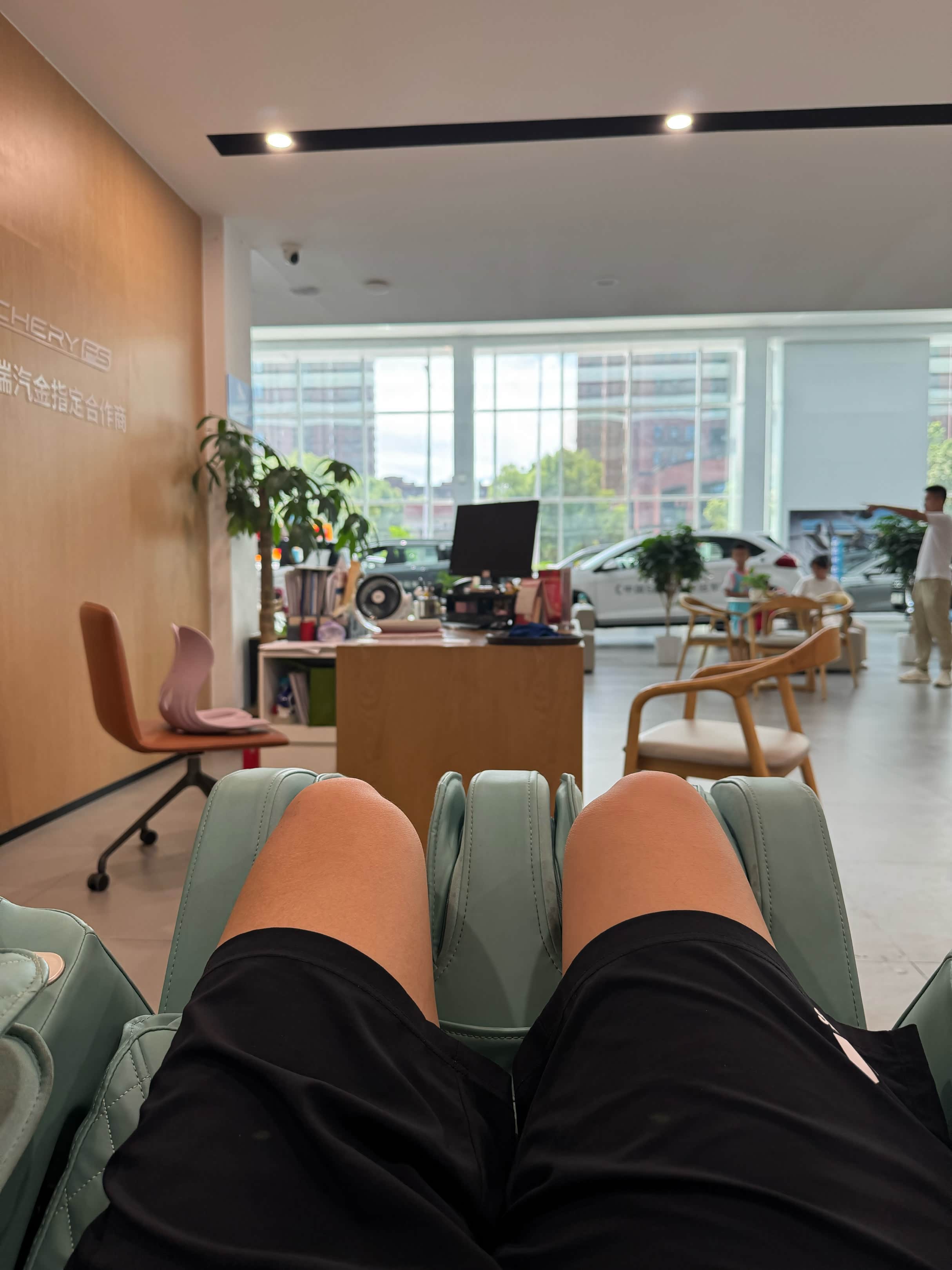 吃完午饭,来到休息室往按摩椅上一趟,舒舒服服的享受一番。保养也比不多结束了。售后师傅把全车检查了一遍,没有问题,电池的健康度还好。