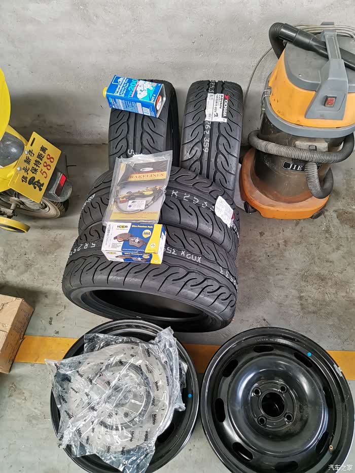 轮毂轮胎的话,选择的目前比较主流的方案,15寸轮毂+195 50 15的轮胎,一来15寸可以控制好簧下质量,二来轮胎比较好选择价格也比较便宜,三来周长小了相当于更换了大尾牙,所以性价比就非常高了。其实我是非常希望上一套漂亮的ssr,但是为了搭配我这个快掉了的前后保险杠,选择了301的原厂轮毂,价格还便宜,重量跟307原厂的铝合金差不多。现阶段先让车子开起来爽才是最重要的,后面会在车身修复阶段换一套旋压或者锻造。
