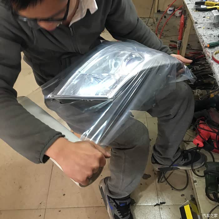 阿武很仔细,把拆下来的大灯先用抹布把上面灰尘擦干净,然后把灯罩包上保鲜膜,怕在改装过程把大灯给刮伤,一看就是干细活的人!