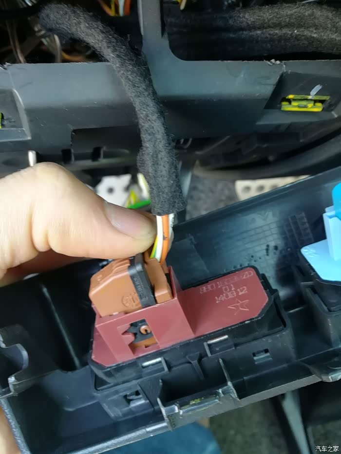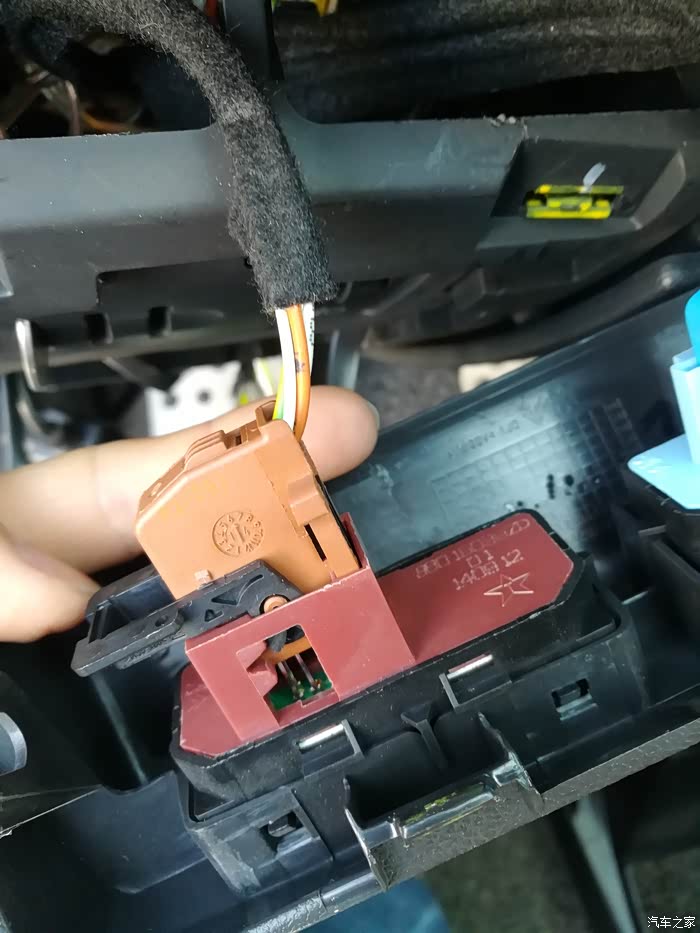 不啰嗦了。氛围灯只是开大灯小灯的时候才亮,不开不亮,想达到这个效果,就要接对线。我开灯观察了一下,油箱盖开关附近的按钮都可以。那就拆这里吧。