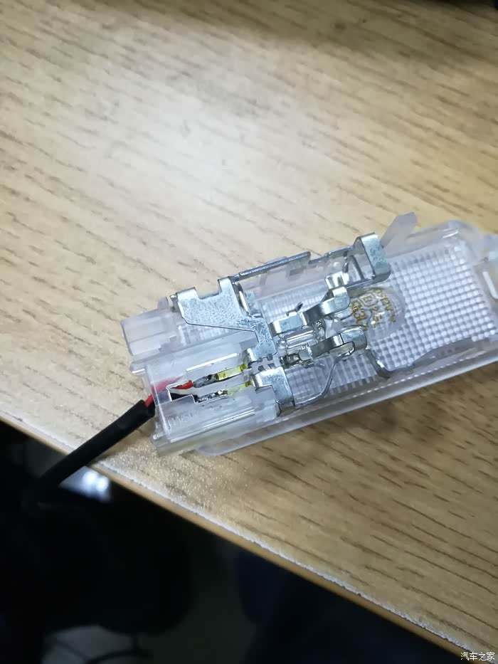 阅读灯的拆法也很简单暴力,网上有很多方法教程 就不多说了。接线如图,负极接左侧插头的黑线,红色正极接左二插头的第三个孔,接法和记录仪的接法不一样