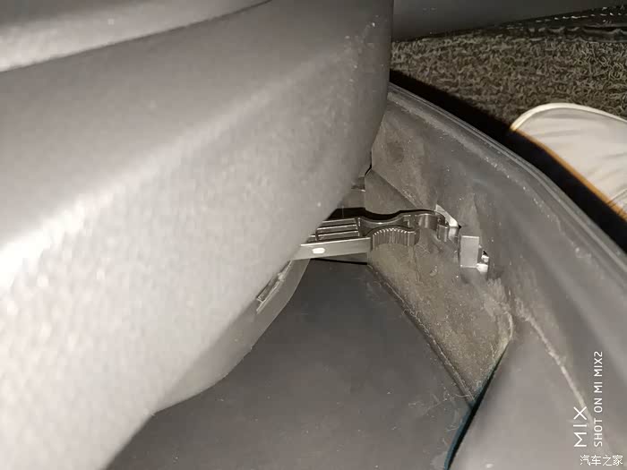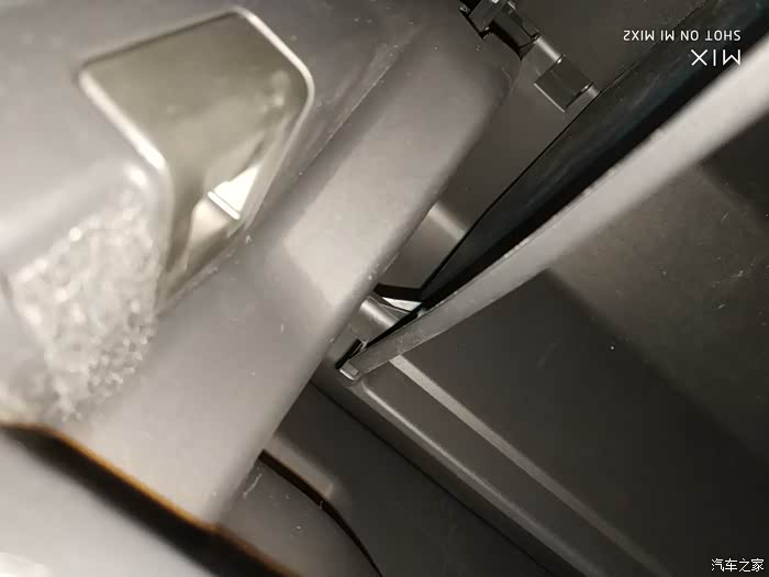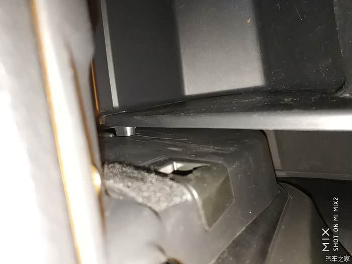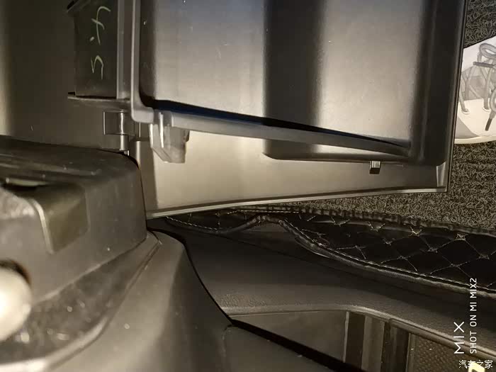 左右同时用力,把塑料内部挤变形,两个卡子拖开,向下??一拉,扶手箱就耷拉着了。