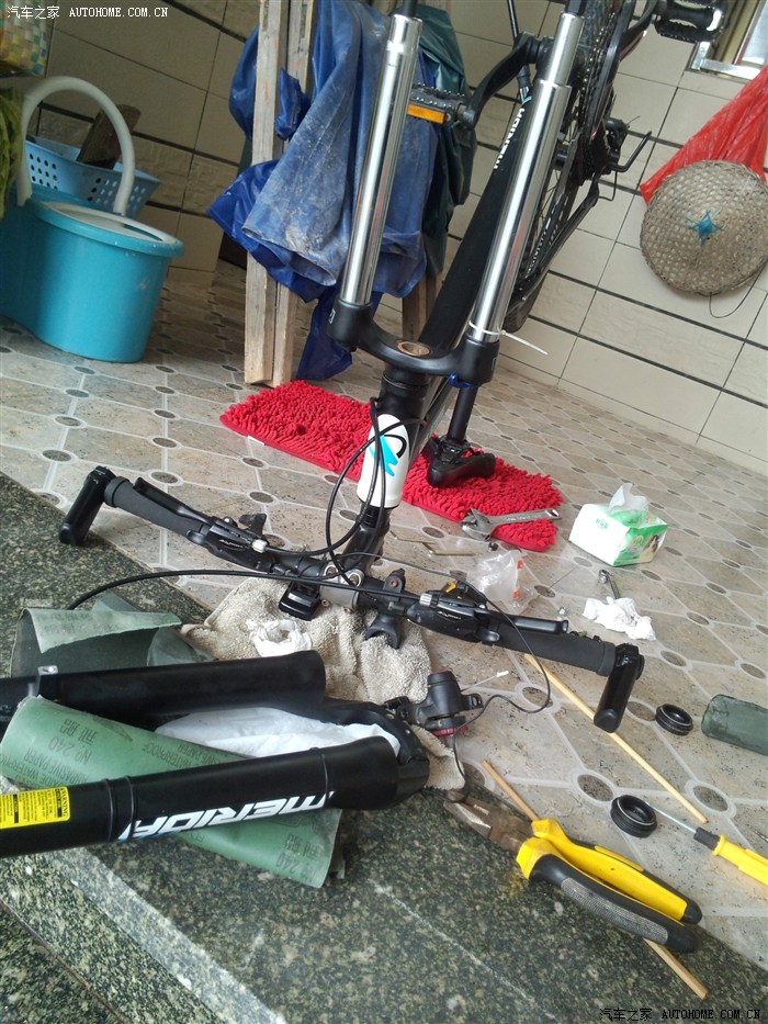 慢慢的,骑得远了,你就越对你的车子有了进一步的了解,在老家的一些崎岖颠簸的山路中越来越觉得公六的XCM前叉性能确实一般,行程短,润度差,你别指望它艹山就是了,能把你手颠麻。于是就看到了网上的一个改XCM前叉的教程,卸前轮,拆前叉,用磨砂纸磨里面的塑料片,加润脂膏,切限行程的树脂胶条。。。