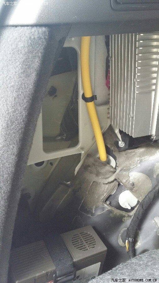 这里还有很重要一步就是走主机和前置面板的连接线。要沿着刚刚拆开的后备箱左侧带固定勾的盖板往后排座椅左侧走,从后排座椅左下的缝隙里引到驾驶室内。这里我忘记拍照片了。