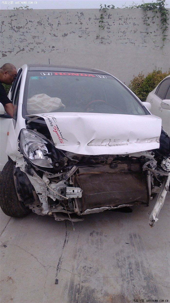 人一点事都有,,,,看来飞度质量,真心不错,,,双气囊都打开了,,,撞成这样了,发动机还没熄火,,,没撞到发动机,,,,我自己灭的火,