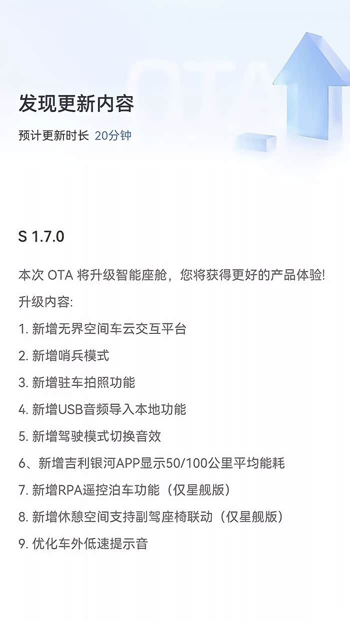 银河e5的车友们最近高兴坏了,因为吉利银河e5首次大版本OTA开始推送升级了,没有收到的同学别着急,一月份开始大批量的推送,如果着急使用的话也可以直接去4S店去升级。届时你的e5将变得更加聪明,本次升级的多个项目中用户呼声最高的是哨兵模式,当然还有驻车拍照、无界空间和遥控泊车等多项其他功能,其中哨兵模式是全系标配的,之前很多兄弟担心440的有没有,现在可以把心放肚子里了,这个功能是全系标配。通过整车高清广角摄像头和传感器实现紧急情况下的自动录像并及时向车主发出报警,提高大家离车后的安全感,不管是车还是手机都可以检测到异常震动,另外,如果车辆监测到人在一米内停留10秒以上车辆就会发出双闪报警,屏幕常亮,显示正在提醒并开始录制视频,而且绑定到手机也会收到消息通知,支持远端查看风险视频,可以有效防止车辆遭遇开门杀或车辆财产受损等问题。另一个就是遥控泊车,大家可以在车外通过吉利银河App遥控车辆实现泊车或直线进出停车位,让停车更灵活、更便捷,操作也十分简单。第三个就是驻车拍照,相信很多人都有过这种经历,因为不记得位置而在停车场找不到车,这次升级了这个功能,停好车后,车辆会主动记录绕车四周透明底盘,鸟瞰图等五张照片上传到吉利银App,点击车辆地址即可查看车辆底部的状态,直接查看车位编号和周围的环境,精准定位,即使在大型商场也不用为找不到车而烦恼了。最后一个就是无界空间,无界空间是吉利银河与腾讯、字节跨界合作开发的智能车源娱乐平台,将运行载体从本地变为云端,释放车机的内存和存储空间,带来更加丰富、更加流畅的娱乐体验,在无界空间里不仅有海量应用,用车机的口味性更加的开放,那么,你升级了吗
