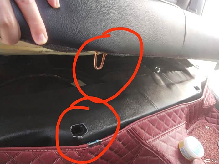 上面两张图标注红线的区域,是另外一处卡扣和卡槽,一边一个,弄的时候,不要使用蛮劲,虽然不会把座椅弄坏,但是容易把卡扣弄坏,使垫子不容易拆下