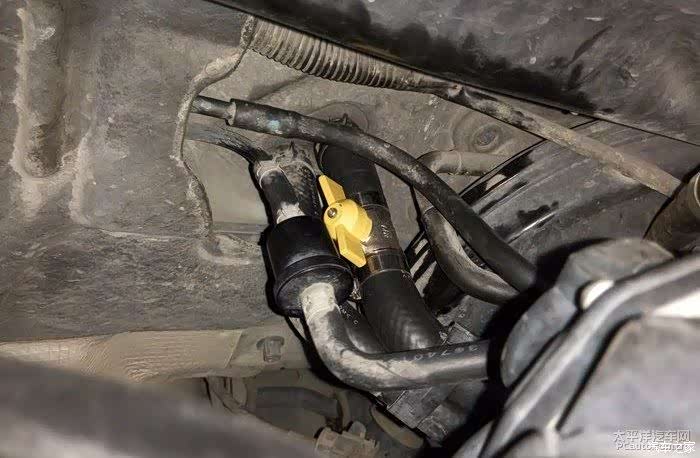 这个图片,显示的是汽车方向盘后面的中间位置,借用别人的图片说明下,这个是另外一个网友,加水阀改装的,我认为中间还有热水存在,我想全部取消,现在看到的,黄色开关那一根管,发动机出来的热水进入空调的热水管,他现在正连接住,空调的热水进水口,那么空调的热水出水口在这根管的下面,图片中刚好挡住了,不怎么看得见,