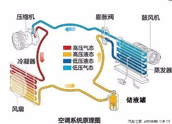 对了,还有一个问题,那个发动机旁边的那个低压管,对应图片中膨胀阀和压缩机之间蓝色的那一段,那冰凉冰凉的,有点水,那根管是冷气释放后,制冷剂又返回压缩机的回路,看到网络上有些网友,把它包起来,怕他冷气跑掉,其实这是错误的,根本就不应该包,设计安排在发动机最发热的地方,就是希望他,吸收热量温度升高,搞清楚这个原理了,就会觉得包起来是十分可笑的,之前,我也差点想包起来,不但不应该包,还应该给它加热呢,