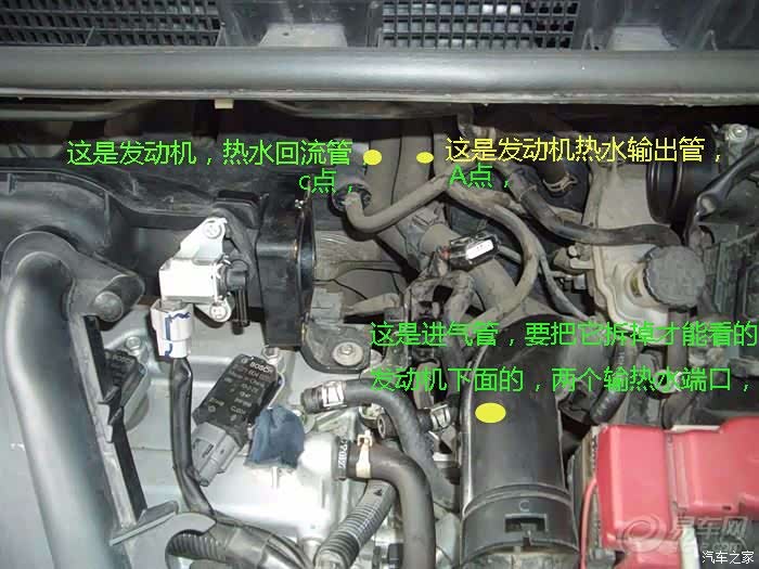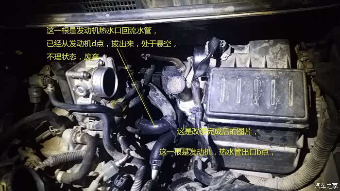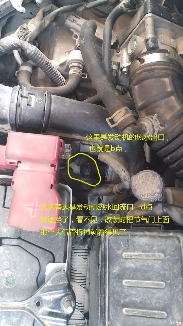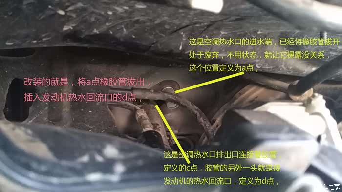 我把黄色,开关那一根接头,命名为a,那么它的尾巴另一端就为b,b点,是接发动机的热水口出口(供应热水),然后,这跟进水管下面是出水管,把黄色开关下面那一根,接头处命名为c,那么管的另外一端,就是d.也就是cd这一段管,是空调热水出口,从d点流回发动机的热水回流口,改装就是把a拔出来,把d也拔出来,直接把a连接到d点发动机的回水口,a点就裸露了一个空管头,没关系,反正,也没有灰尘进入,或者随意塞一点泡沫也可以,