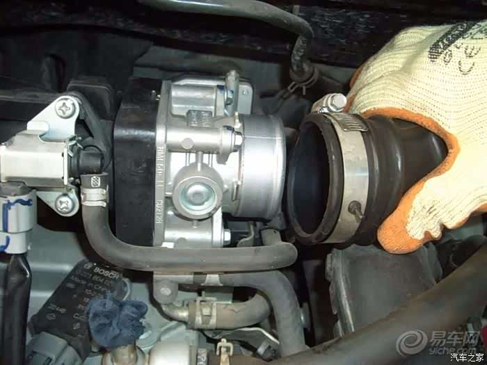 这张图片显示的是拆开节气门,大的橡胶管,这个用一把螺丝刀扭开管的两端,就行了,很简单,节气门这个铁家伙,需要拆开上面四个小螺丝,其中有一个螺丝,需要用加长杆才好拆,最好用棘轮扳手,看下图,
