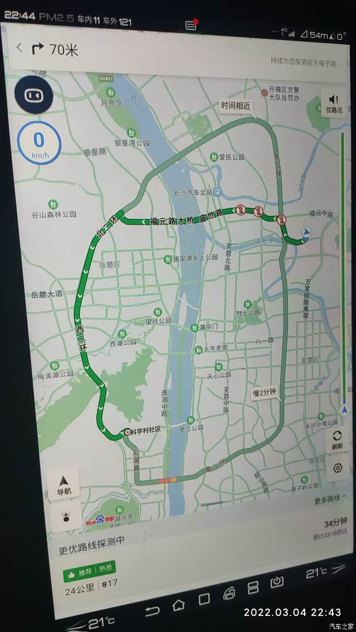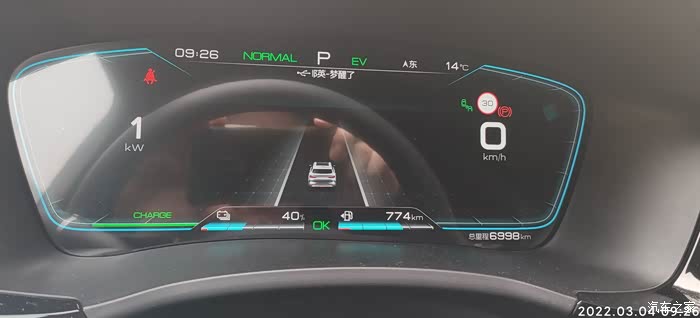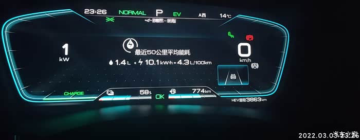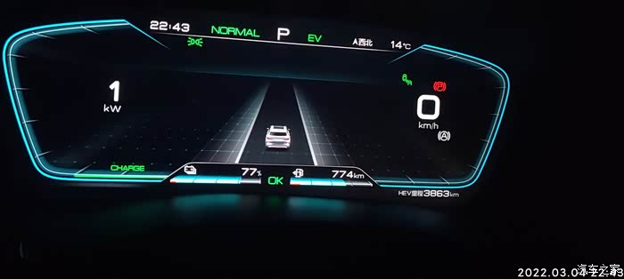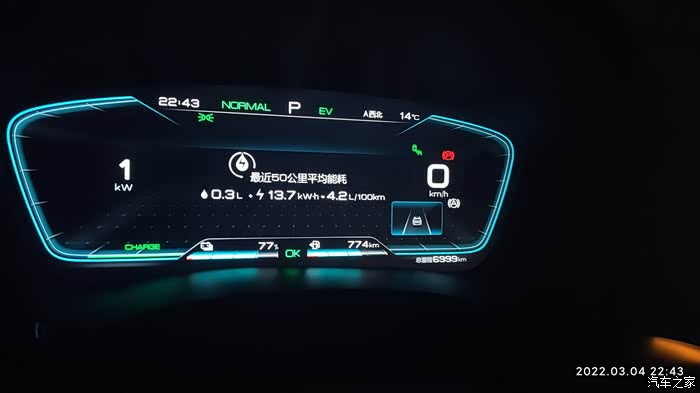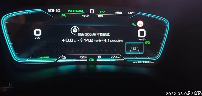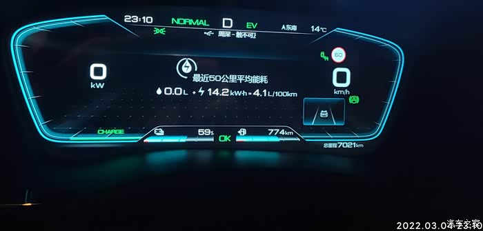 2022-03-04 晚上下班,因为充电到77%自动为EV模式。耗电量=出发电量-到达电量 77%-59%=18% , 到达总里程-出发总里程7021-6999=22KM,到达和出发的HEV里程一样都是3863KM,EV行驶,基本上顶最高限速,见车超车,红灯基本是排头兵。空调21度,没有制热也没有制冷,剩余油量774,和早上一样,70%的样子,气温14度,空调设置21度,不制冷也不制热,综合油耗4.1。