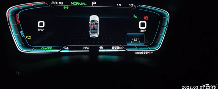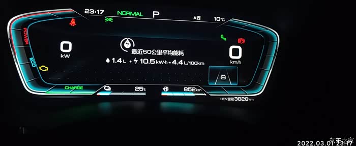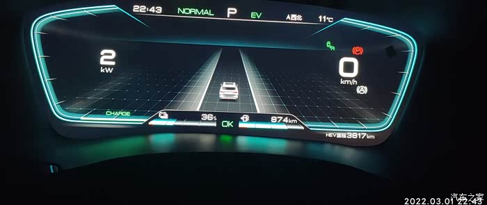 2022-03-01,晚上下班,EV模式,燃油消耗=出发油量874-852=22KM,出发电量-到达电量 36%-25%=11% , 到达总里程-出发总里程6884-6860=24KM,到达和出发的HEV里程3828-3817=11KM,驾驶比较激烈,气温10-11度,空调设置21度,制热,综合油耗4.4。
