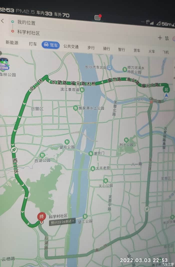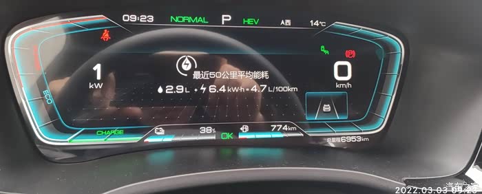 2022-03-03,早上上班,HEV模式,燃油消耗=出发油量800-774=26KM,出发电量-到达电量 45%-38%=7% , 到达总里程-出发总里程6953-6936=17KM,到达和出发的HEV里程一样都是3863-3854=9KM,早上出大拍HEV历程后走了4分钟到河边才记起拍下总里程,全程应该也是20KM左右,有一段路比较堵车,换道超车激烈驾驶比较多,气温14度,空调设置21度,跑了一段发现空调自动开了压缩机,不知道是啥情况,综合油耗4.7。
