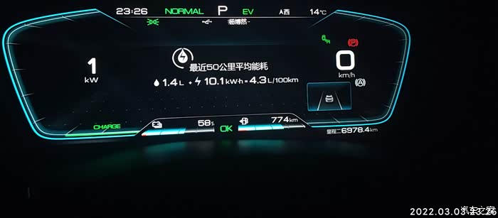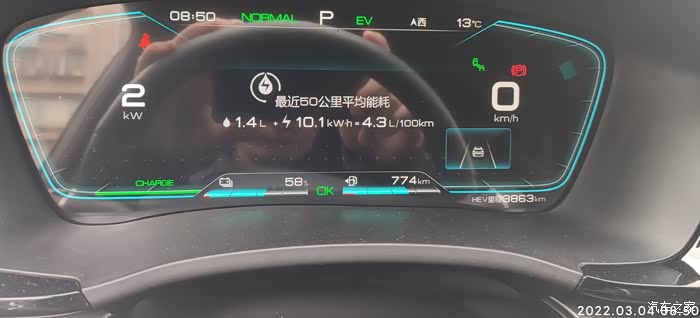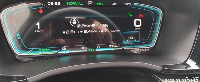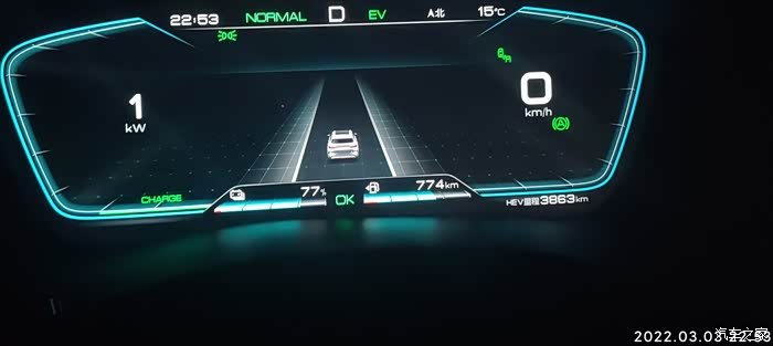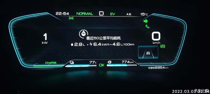 2022-03-03 晚上下班,充电到77%,EV模式。耗电量=出发电量-到达电量 77%-58%=19% , 到达总里程-出发总里程6978.4-6954=24.4KM,到达和出发的HEV里程一样都是3863KM,全程EV行驶,基本上顶最高限速,见车超车,红灯基本是排头兵。空调21度,没有制热也没有制冷,剩余油量774,和早上一样,70%的样子,(这里有燃油消耗量估计是以前没有充电的时候跑的,后面越跑EV里程油耗量平均下来越小),气温15度,空调设置21度,不制冷不制热,综合油耗4.3.