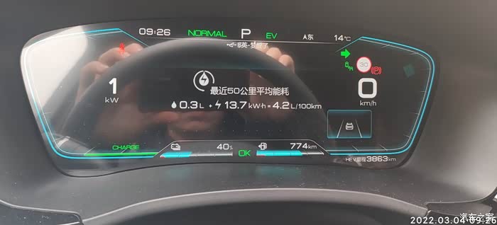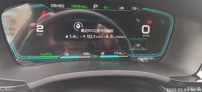 2022-03-04,早上上班未充电,自动为昨天的EV模式。耗电量=出发电量-到达电量 58%-40%=18% , 到达总里程-出发总里程6998-6978=20KM,到达和出发的HEV里程一样都是3863KM,全程EV行驶,见车超车,早上路线红绿灯较多,比晚上一般堵车厉害。空调21度,没有制热也没有制冷,剩余油量774,70%的样子,气温13-14度,空调设置21度,不制冷也不制热,综合油耗4.2.