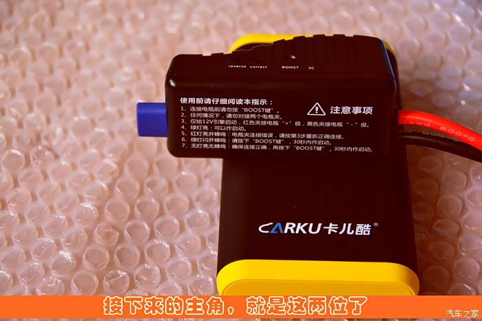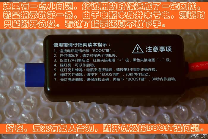 看到智能电瓶夹上印刷的字样,我当时是彻底蒙了——“连接电瓶前请勿按'BOOST键'”——是不是意味着计划中的,断开电瓶负极进行测试的计划要胎死腹中?!